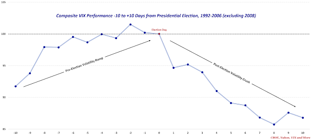 This raises the question of how jumpy the VIX tends to be in advance of elections and what happens after the election. If you know anything about what happens to the VIX around FOMC announcement days, you will find considerable similarities when it comes to elections. Specifically, the VIX responds to the upcoming event risk by increasing steadily into the event, dropping sharply on the day of the event and declining even more as the event recedes in the rear-view mirror.